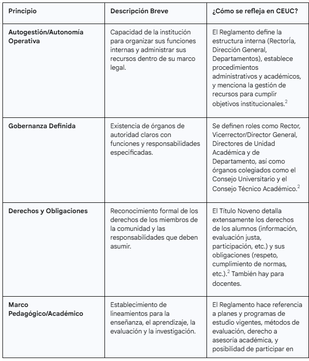 Definición de Identidad y Propósito: Los reglamentos articulan la misión, los valores y los objetivos de la institución.11 Aunque la misión específica de CEUC no se detalla en todos los documentos revisados 5, su Reglamento General 2 define una estructura y objetivos institucionales, proporcionando un entendimiento compartido de lo que la universidad representa y busca lograr.