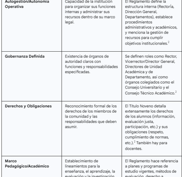 Claridad Académica: El reglamento define las reglas del juego académico: requisitos de admisión, criterios de evaluación, normas para cursar y aprobar asignaturas, y las distintas opciones para la titulación.5 Establece cómo se realizan las evaluaciones y el derecho a solicitar revisiones si existen inconformidades.1